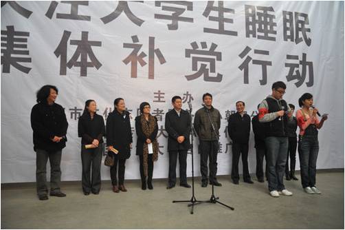 当天开幕活动以“关注大学生睡眠,集体补觉行动”为主题,场馆内一百名大学生用集体“补觉”行为,呼吁社会关注当今大学生的睡眠问题及身心健康。而同时放映的短片《失眠的理由》则尝试找出大学生失眠问题的由来及解决方法。同时,现场还有《睡在我上铺的兄弟》情景歌曲演唱、乐队演出及部分摄影绘画作品的展览。下午三时许,开幕式圆满结束。