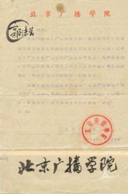 1964 年,北京广播学院编印的《广播稿选》第一集出版。这本书选集了中华人民共和国成立以前延安、陕北、北平新华广播电台广播过的广播稿四十多篇。其中有人大常委会副委员长、中国文联主席的郭沫若先生的一篇演讲稿。在编辑此书时,郭沫若先生提供了很多帮助和指示。为了表示感谢,学院特赠书一册以表纪念,同时还请郭沫若先生为学院题写“北京广播学院”六个字,做横匾用。11 月 11 日,郭沫若在回信中为北京广播学院题写了校名,成为学院的珍贵纪念。