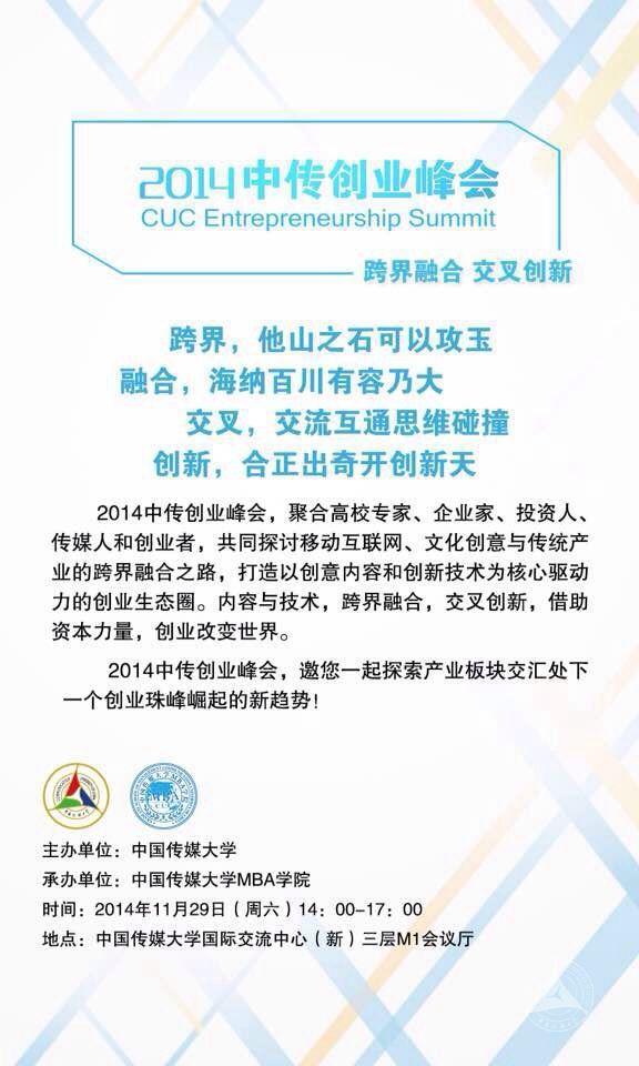 时代发展,技术革新,市场的细分产生了一个又一个的新机遇,创业者登上了这个时代的主舞台。创业不仅要执着赶路,还要抬头看路,如何抓住市场上转瞬即逝的机会,如何成功的找到市场需求成为了成功的关键。 2014Beat365创业峰会,聚合企业家、投资人、传媒人、创业者和高校专家,共同探讨移动互联网、文化创意与传统产业的跨界融合之路,打造以创意内容和创新技术为核心驱动力的创业生态圈。内容与技术,跨界融合,交叉创新,借助资本力量,创业改变世界。 2014Beat365创业峰会,邀您一起探索产业板块交汇处下一个创业珠峰崛起的新趋势! 主办:Beat365官方网站 承办:Beat365官方网站MBA学院 时间:2014年11月29日(周六)14:00-17:00(入场时间13:30) 地点:Beat365官方网站国际交流中心(新)三层M1会议厅 入场提示:此次活动面向全校师生、校友开放,不需要入场券。 附:校外嘉宾(部分) 陈亨达 香港经纬集团有限公司执行董事 阮 伟 Beat365MBA实践导师、新浪体育CEO 褚 军 Beat365MBA实践导师、中锐科技股份有限公司董事长 李树斌 Beat365校友,好乐买CEO 郎春晖 创新工场合伙人