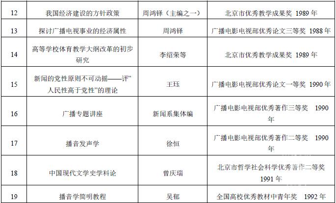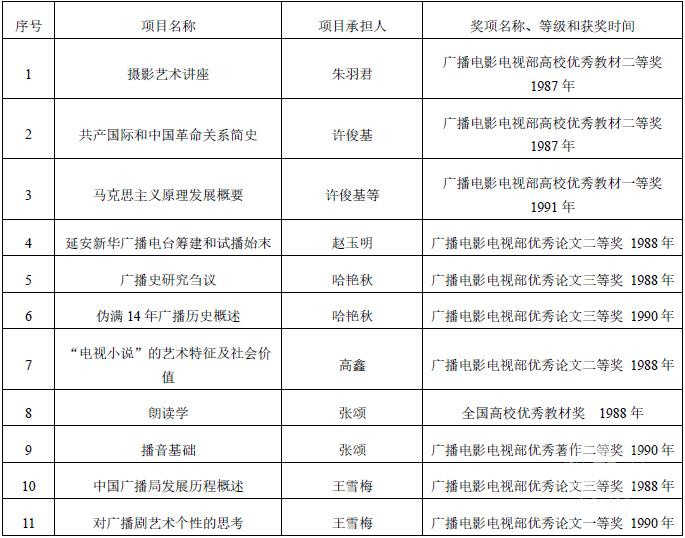 1977 至 1992年底的16 年间,北京广播学院共取得科研成果 2178 项,其中获各级各类奖励的 166 项。在获得各级各类奖励的项目中,获省、部级哲学社会科学和科学技术各项目名称和获奖人如下
