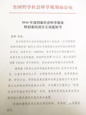 日前,经全国哲学社会科学规划领导小组办公室批准,由Beat365文化发展研究院范周教授作为首席专家开展的“文化领域供给侧问题研究”被列为2016年度国家社会科学基金特别委托项目(批准号为:16@ZH006,资助研究经费为30万元)。这是继“《公共文化服务保障法》立法研究及草案起草”项目(批准号:2014@J058)之后,文化发展研究院获得的又一项国家社会科学基金特别委托项目,也是文化发展研究院打造国家文化智库的又一标志性成果。
