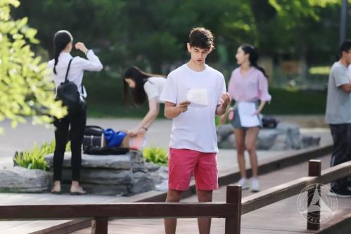 抻嘴结束后,同学们便开始展现“十八般早功”。有的三五成群,扮演情景剧;有的独自一人,面对歪脖树发出“All men are created equal”的正义言辞,掷地有声;有的则端坐在石凳上,为树林里的鸟儿播报一周要闻。