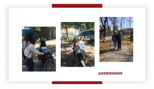 大二的时候,我们班有同学不慎腿部骨折,正所谓“患难见真情”,在她受伤的那几个月里,我们同学每天会推着她去上课,扶她上下楼梯,帮她买饭。此外当有同学在中蓝公寓门口不慎被流浪狗咬伤时,同学们也是在第一时间陪她一起去医院检查打针。