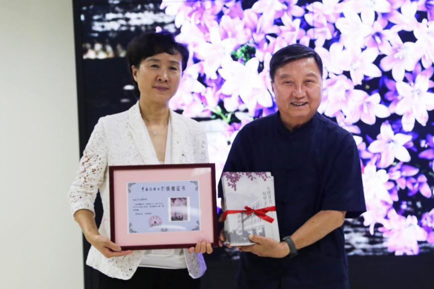 章振兰副馆长向新书主创作者颁发图书捐赠证书,59级新闻系校友、原国家广电部党组成员、中国国际广播电台台长张振华代表领取