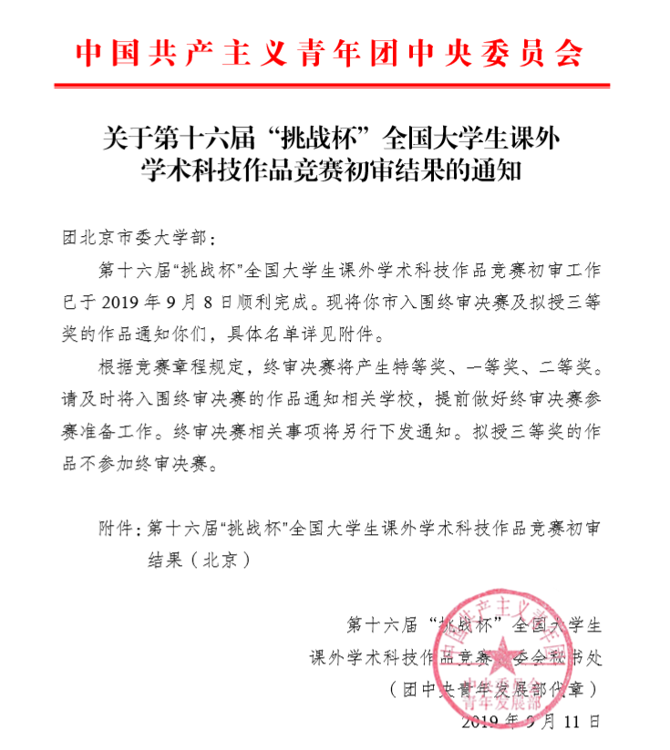 学校高度重视参赛作品的推送甄选,充分发动校内师生参与,校团委组织举行了2019“挑战杯”首都大学生课外学术科技作品校内选拔赛,经过评审,共有20件作品分获校内赛的一二三等奖,最终遴选出15件作品代表学校参加市赛评选。