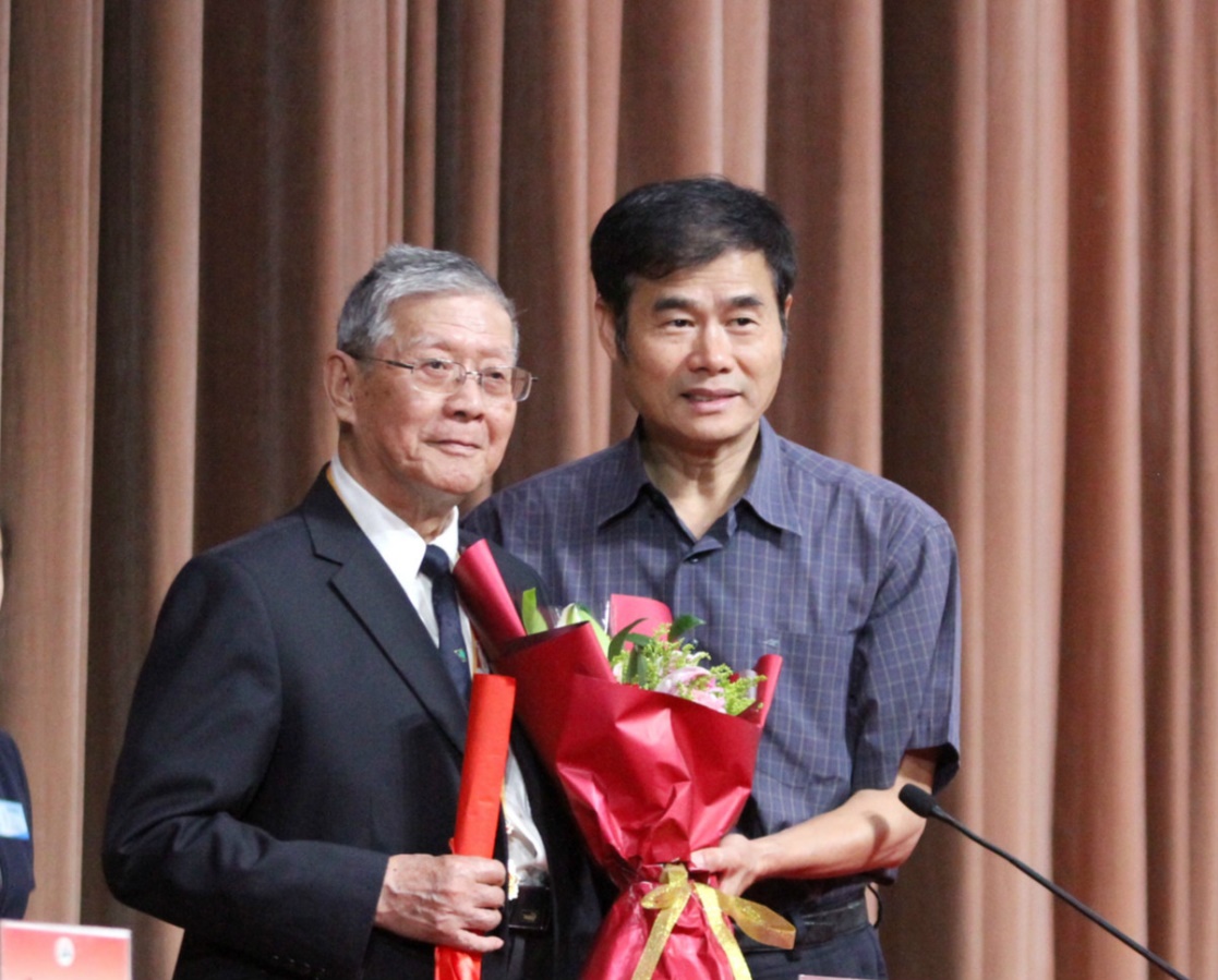 陈文申书记和刘守训副校长为老寿星代表献上祝福的贺卡、鲜花和老年书法协会题写的寿字条幅作品。会后,老年摄影协会的会员们为老寿星摄影,留下珍贵的幸福瞬间。