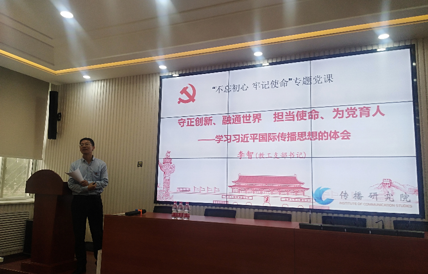 李智教授说,守正是基础,要恪守正道,不忘共产党人的初心、本心。创新是路径,要走出新路:一是渠道创新,构建融通中外的新概念、新范畴、新表述对外传播话语体系;二是内容创新,注重文化和国家形象的塑造;三是目标创新,争取国际话语权。融通是目标,“融”古今中外,“通”世界民心,要站在构建人类命运共同体高度上,打造各方合作的新疆域,构建互联网命运共同体。他结合自身的教学工作表示,要担当使命,为党育人,就把学术使命和政治使命相结合,把学术生命和政治生命相融合,增强作为传媒学术领域共产党人的忧患意识、使命意识和创新意识。他还汇报了传播研究院教工党支部在组织建设、制度建设、思想建设等方面取得的成绩,凝练了“以学习为主导、以实践为根本”的支部建设思路。