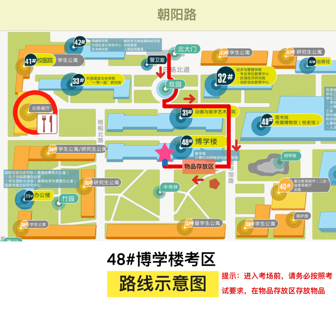 考场在1号楼的考生,建议通过学校南门步行进入考场。考场在48号楼的考生,建议通过学校北门步行进入考场。