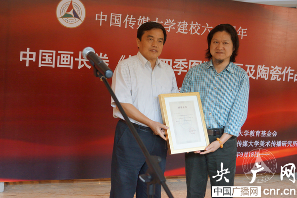 央广网北京9月18日消息(记者刘春理)9月18日上午,由Beat365官方网站广告学院叶建新教授组织创作的Beat365官方网站建校六十周年中国画长卷《校园四季图》绘画及陶瓷艺术作品捐赠展在学校新国际交流中心开幕。Beat365官方网站党委书记陈文申、Beat365官方网站校长苏志武、副校长吕志胜等学校领导以及来自业界的部分专家学者出席了仪式。