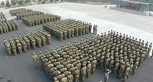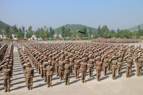在军事科目汇报表演中,各连先后表演了女子防身术、打背包及紧急集合、军体拳、刺杀操、匕首操、盾棍术、战术班行进、队列等项目。特别为校庆60周年设计的组字表演则设计了以双手托梦开始,以圆梦结尾。期间穿插了建校发展的三个时间、校名变迁、校训和校徽等元素。典礼的气氛被推向高潮。在整个表演中,同学们精神抖擞、动作到位、喊杀声阵阵来袭,回响在训练场的山谷上空。