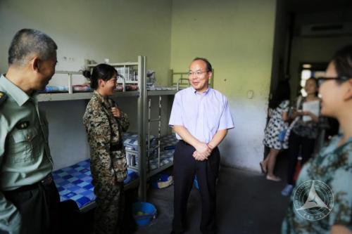 为了了解军训团的生活条件,刘守训副书记分别察看了医务室、基地食堂和学生公寓。在医务室,刘副书记详细询问了参训学生的伤病就诊情况及医务室成员组成情况,据齐金贵政委介绍,为了保障同学们的训练安全,校医院再次派出马蓉蓉副院长带队的4名随队军医,还增加了现场巡诊频次,过去是定点巡视,现在是现场流动巡视,确保现场有突发状况时校医第一时间赶到现场。