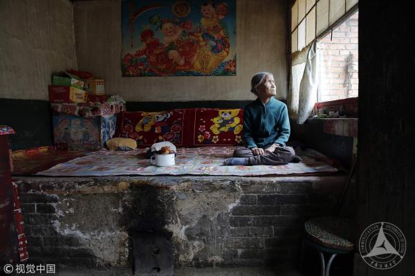 Former Chinese "comfort woman" Zhang Xiantu rests on a traditional brick bed in her house in Xiyan Town, Shanxi Province, China, July 18, 2015. /VCG Photo