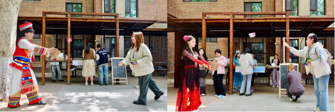 市集还设置了多个互动游戏摊位,在“山海同心”民俗挑战营中挑战高山族背篓投球;沉浸式体验朝鲜族顶瓮行走;在“版图探秘·民族智慧堂”中感受趣味贴贴乐和知识擂台赛。通过这些充满民族特色的游戏,同学们更加深入地了解各民族文化,在润物无声中增进中华文化认同。