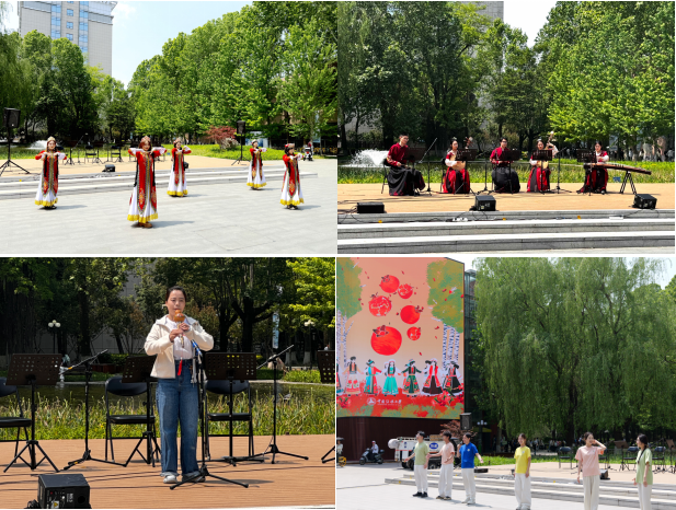音乐与录音艺术学院、传播研究院、文化产业管理学院、信息与通信工程学院、外国语言文化学院的同学们以精湛的技艺和饱满的热情,呈现了一场融合多元民族文化的视听盛宴。男女重唱《春天》朝气蓬勃、民族乐五重奏《敦煌》古韵悠长、新疆舞蹈《酒歌翩跹・石榴花开》欢天喜地、葫芦丝独奏《月光下的凤尾竹》清幽空灵、维吾尔族舞蹈《欢乐的跳吧》活力四射、古典舞《大唐盛世》气势恢宏,各类节目轮番上演,展现了民族团结的情感与文化交融的魅力。