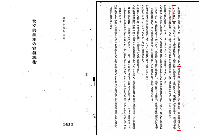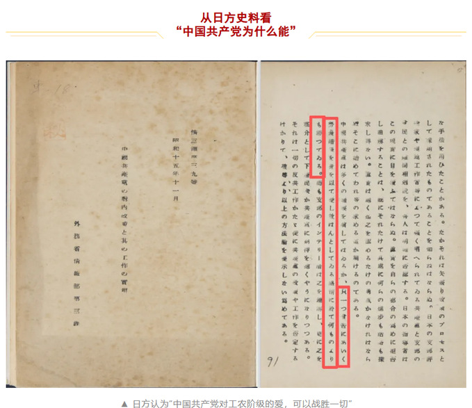 日方认为,中国共产党正在不断获得胜利。1940年日本外务省情报部的档案《中国共产党的对内政策及其工作真相》指出,“中国共产党各级干部对中国四亿工农阶级都充满了同情心”,“中国共产党对工农阶级的爱,可以战胜一切”,“中国共产党正在不断获得胜利”。