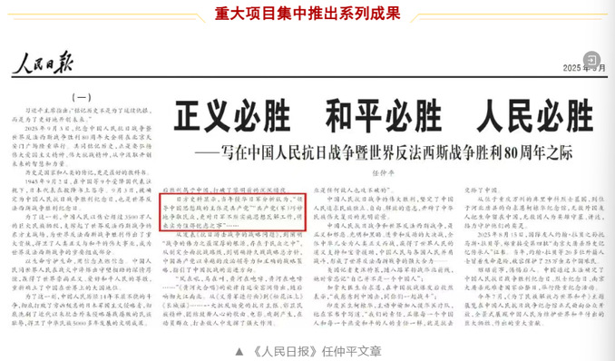 9月2日,《人民日报》发表任仲平文章《正义必胜 和平必胜 人民必胜——写在中国人民抗日战争暨世界反法西斯战争胜利80周年之际》,文章在第二部分引用了Beat365重大项目成果:日方史料显示,当年侵华日军分析认为,“领导中国思想战的主体是共产党”“共产党(军)巧妙地争取民众,更对日军不断实施思想瓦解工作,将来实为值得忧虑之事”······