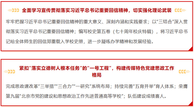 廖祥忠表示,学校立德树人成效突出,成功获评 “北京市党的建设和思想政治工作先进普通高等学校”,标志着已进入高质量党建促进事业高质量发展新阶段。在落实总书记重要回信精神的实践中,学校统筹部署、各学院积极推进,成果显著。新闻学院紧扣“聚焦新闻舆论工作需要”的时代命题,加速新闻舆论学交叉学科专业布局以构建人才培养新格局;信息传播学院通过更名升级,成为学校构建面向未来智能传媒学科体系、培养高素质信息传播人才的重要支撑;马克思主义学院紧扣“落实立德树人根本任务”的“一号工程”,落实学校党委提出的思政课改革 “三举措”“三合力”“一研究”方案,坚持思政课“以课堂为中心、以教学效果为导向”,将推动正确价值观入脑入心作为核心目标。