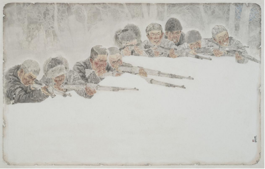 作者阐释:画面聚焦战斗前的静谧时刻,在黎明将至的黑暗中作战士兵的坚毅面孔以及军民匍匐并肩的身影表现了全民抗战的深沉力量,表达了对民族精神的高度礼赞。