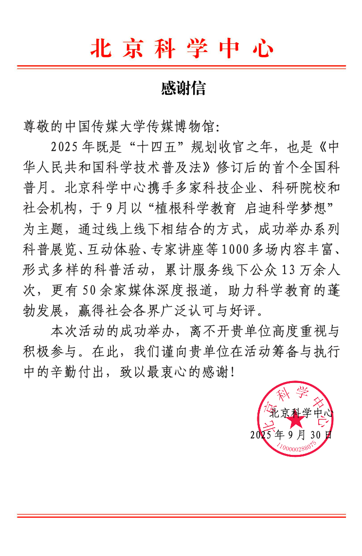 2025年9月17日至21日,传媒博物馆应邀参加了在北京科学中心举办的“全国科普月主场活动”,在北京科学中心设立独立展位,以“传媒科技变革”为核心,精选并展出了 21件标志性藏品勾勒了传媒技术演进的历史;同时,还设置“‘传神’拓片”“克拉德尼板声波可视化”“可视化磁生电”“机械打字机”四项互动设备。活动期间,传媒博物馆展区内吸引超3万人次参观、体验。此次,参与全国科普月主场活动,传媒博物馆精心准备,把传媒科技转化为通俗趣味的亲身体验,既收获观众好评,也得到北京市科协充分肯定和专题推介。活动结束后,北京市科技中心专门向传媒博物馆发来感谢信。