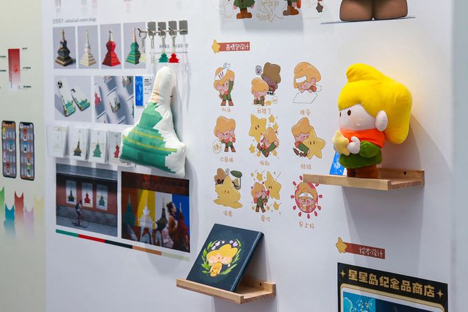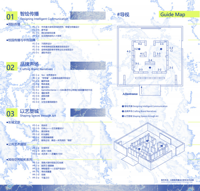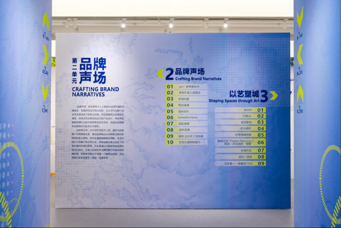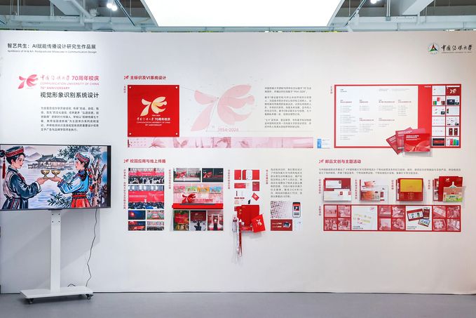 主题单元展览共设“智绘传播”“品牌声场”“以艺塑城”三大版块,系统呈现研究生在“AI赋能传播设计”领域的探索与成果。“智绘传播”聚焦智能技术、传播路径与设计实践的深度融合,展示研究生在国际传播与品牌传播方向上的创意实验,作品以生成式人工智能、多模态叙事等手段探索数智时代的传播形态与文化表达;“品牌声场”关注人工智能与品牌传播的融合创新,涵盖商业品牌重塑、文化品牌活化及数字思辨实践,展现AI在品牌构建中的创意潜能与意义生成;“以艺塑城”则聚焦空间设计与区域文化的共生关系,通过公共艺术、沉浸叙事与交互体验,探索城市、景观与文化遗产在智能语境下的再生机制。三大版块共同构成了一个兼具学术深度与时代前瞻性的设计图景,不仅直观呈现了“人机协同”的教学理念,更体现出传播设计学科服务国家战略、回应社会需求的责任担当。