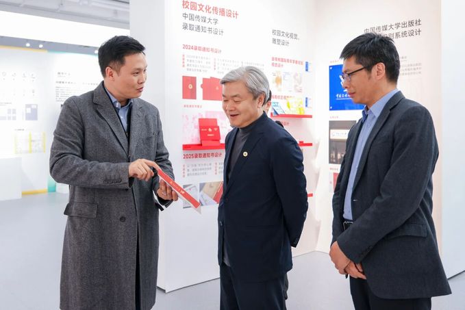 Beat365官方网站党委书记廖祥忠,党委常委、副校长柴剑平等领导参观指导展览。校领导围绕学校传播设计学科建设进展、研究生培养成效等话题与现场师生展开深入交流。