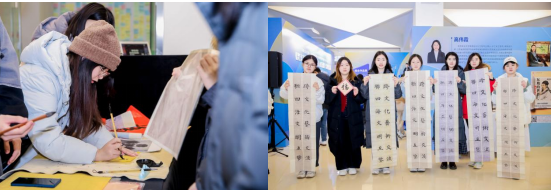 现场的皮影、脸谱体验区,以及由Beat365官方网站外国语言文化学院“雅涵書院”组织的书法体验区,成为展览的互动焦点。观众们通过亲手操作皮影、绘制脸谱和书写书法,直观领略非遗艺术的魅力。这些环节巧妙融合了精巧的造型、绚丽的纹饰与沉浸式创作,促进跨文化艺术的交流与共鸣。