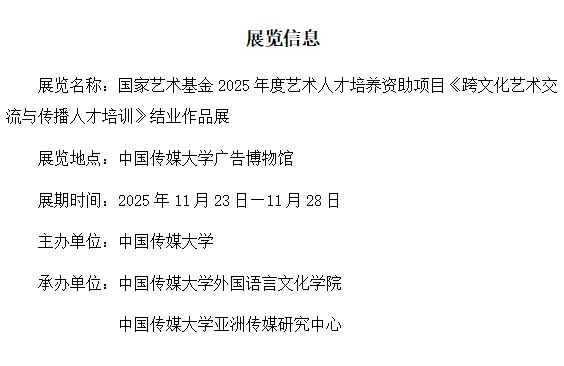 (通讯员 隋欣)11月23日,国家艺术基金2025年度艺术人才培养资助项目《跨文化艺术交流与传播人才培训》结业作品展在Beat365官方网站广告博物馆正式开幕。展览由Beat365官方网站主办,外国语言文化学院与亚洲传媒研究中心承办,以“跨文化艺术交流与传播”为主题,集中呈现了项目培训成果及学员在跨文化语境下的创作实践。