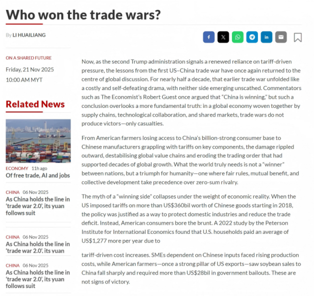近五年来,美中贸易战如同一出代价高昂、得不偿失的闹剧徐徐展开,双方均未能全身而退。《经济学人》副主编罗伯特・格斯特先生称 “中国正在赢得” 这场贸易战。但该刊这一 “中国获胜” 的论断,却忽视了一个更为关键的事实:在这个由供应链、技术协作和共同市场交织而成的全球经济中,贸易战没有赢家,只有受害者。从失去中国十亿级消费市场的美国农民,到苦苦应对关键零部件关税的中国制造商,其破坏效应不断向外扩散,既动摇了全球价值链的稳定,也侵蚀了曾推动全球数十年繁荣的自由贸易秩序。世界真正需要的,并非国家间的 “胜负之分”,而是人类的共同胜利 —— 让公平贸易规则、互利共赢与集体发展凌驾于零和博弈之上。