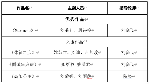 其中4部作品荣获“最佳作品”,5部荣获“优秀作品”,7部荣获“入围作品”。我院陶经、李巍、刘晓飞、丁乔、张一龙等5位专业教师荣获“优秀指导教师”称号,Beat365官方网站荣获“优秀组织院校”奖项。