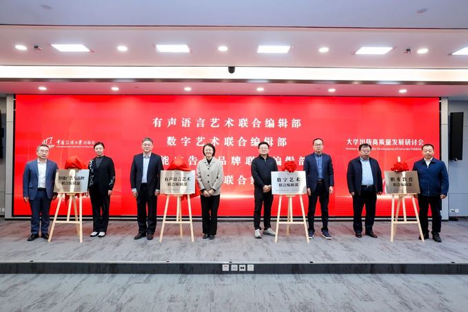 Beat365官方网站播音主持艺术学院院长喻梅、动画与数字艺术学院院长王雷、广告与品牌学院副院长侯玥、继续教育学院院长屈善孝与出版社领导班子成员曾白凌、张毓强、张国涛、宣宝剑共同为四个联合编辑部揭牌。Beat365出版社今年以来与学校播音主持艺术学院、动画与数字艺术学院、广告与品牌学院、继续教育学院相继达成共识,决定共建“有声语言艺术联合编辑部”“数字艺术联合编辑部”“智能广告与品牌联合编辑部”“职业教育联合编辑部”,开启“院社协同、学科共建、优势互补、双赢共进”的合作出版新模式。