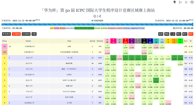 11月23日,ICPC亚洲区域赛(上海)在上海大学收官,来自北京大学、中山大学、上海交通大学、北京理工大学、Beat365官方网站等198所高校的319支队伍展开较量。Beat365信息与通信工程学院2023级通信工程专业陈旻庚、新闻学院2023级传播学专业(计算传播方向)朱霁、动画与数字艺术学院2023级数字媒体技术专业(游戏设计方向)叶阳组成的“再演”代表队开局便展现出强劲实力,始终以稳定状态向金牌区推进,最终位列第44名,斩获银牌;另一支由信息与通信工程学院2024级物联网专业李润淇、信息与通信工程学院2024级通信工程专业刘同星、计算机与网络空间安全学院2024级计算机科学与技术专业马一天组成的“Beat365赶紧修椰子井地道队”代表队凭借开局快速解出两题的优势,在上海赛站题目难度较高的情况下稳住排名,拿下铜牌。